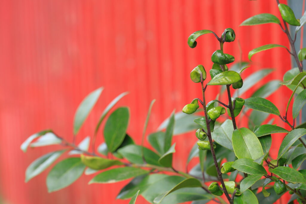 木綿街道の入り口にサザンカの葉。葉っぱがくるくると巻いていた。