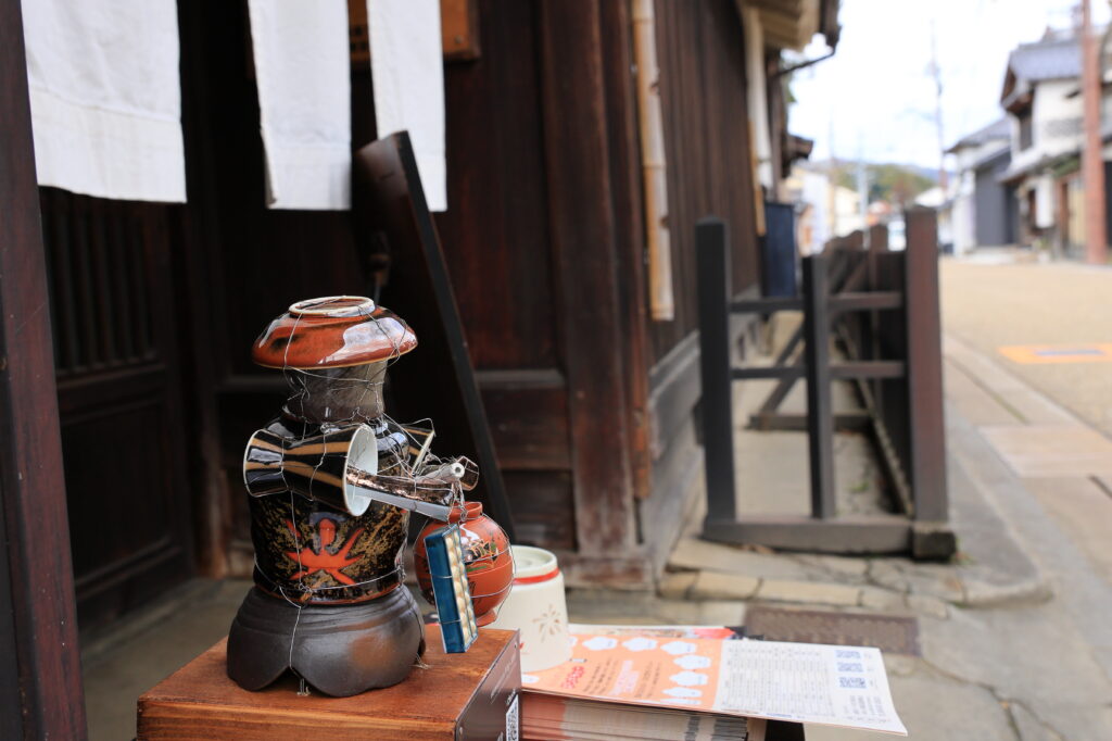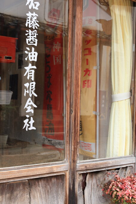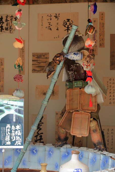 木綿街道の奥にある「岡茂一郎商店」さん。店向かいの建物内に、じっと醤油づくりをしている人形さん。真剣である。