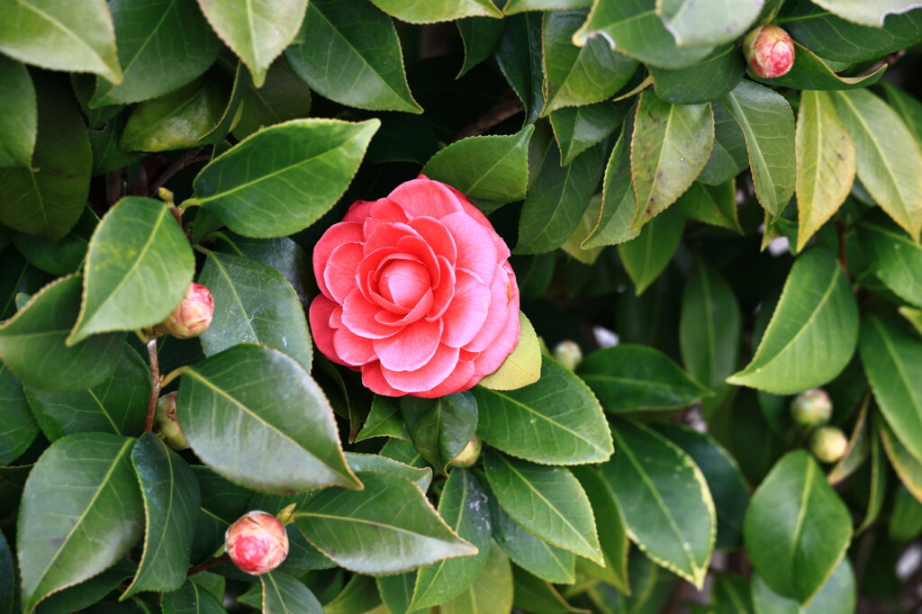温かい陽に照らされて、サザンカの花が綺麗に映えていた。